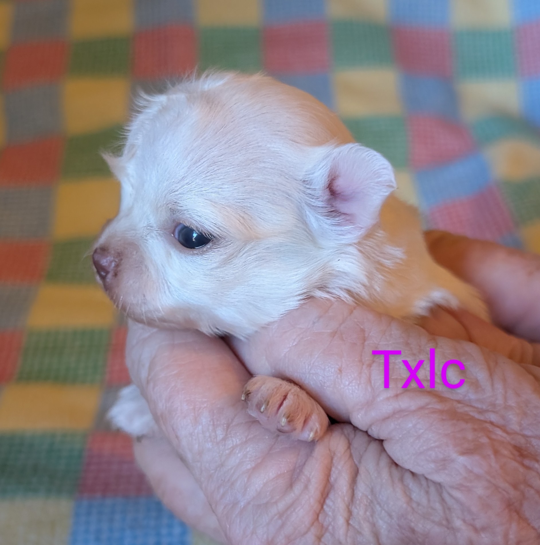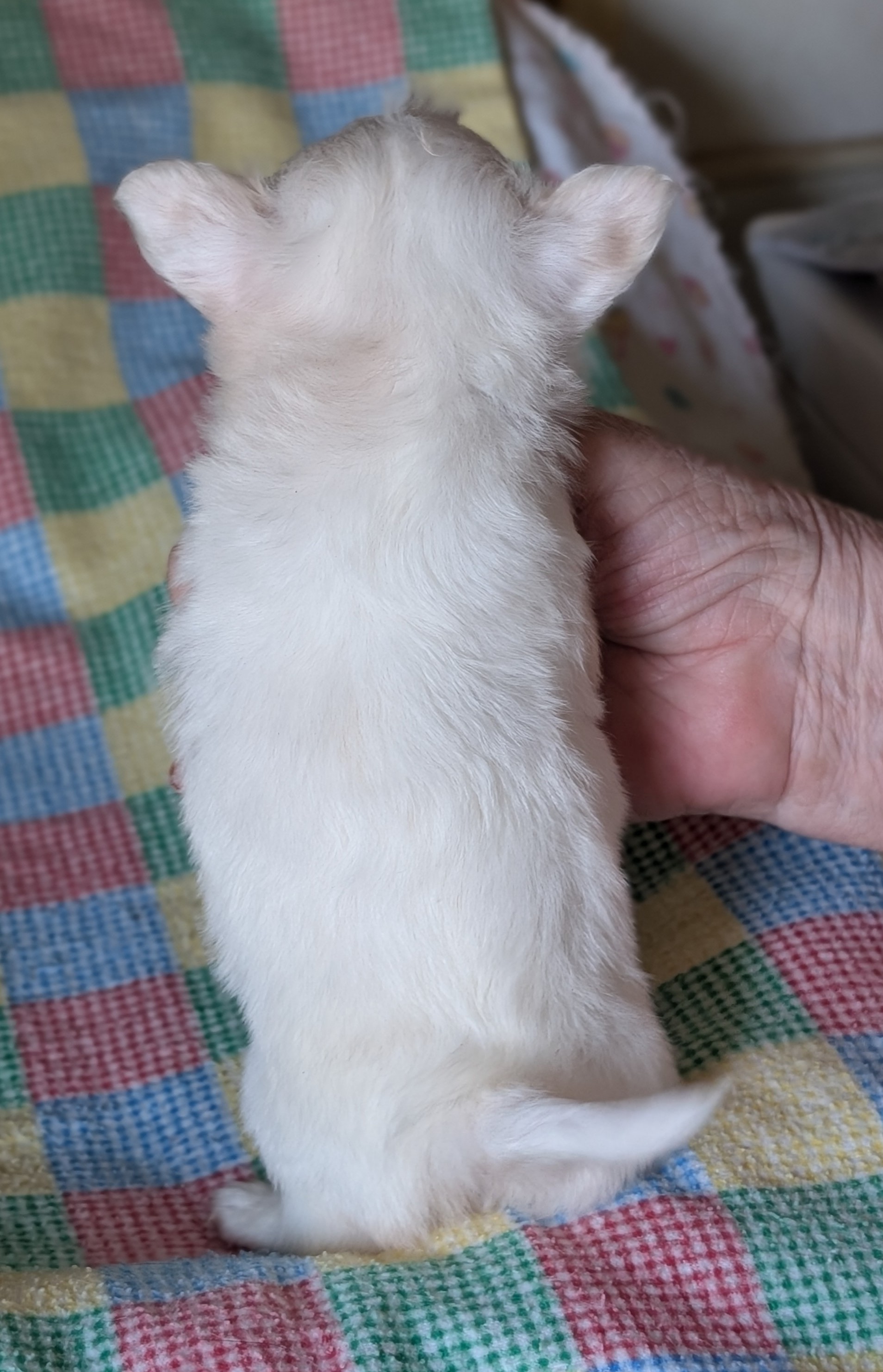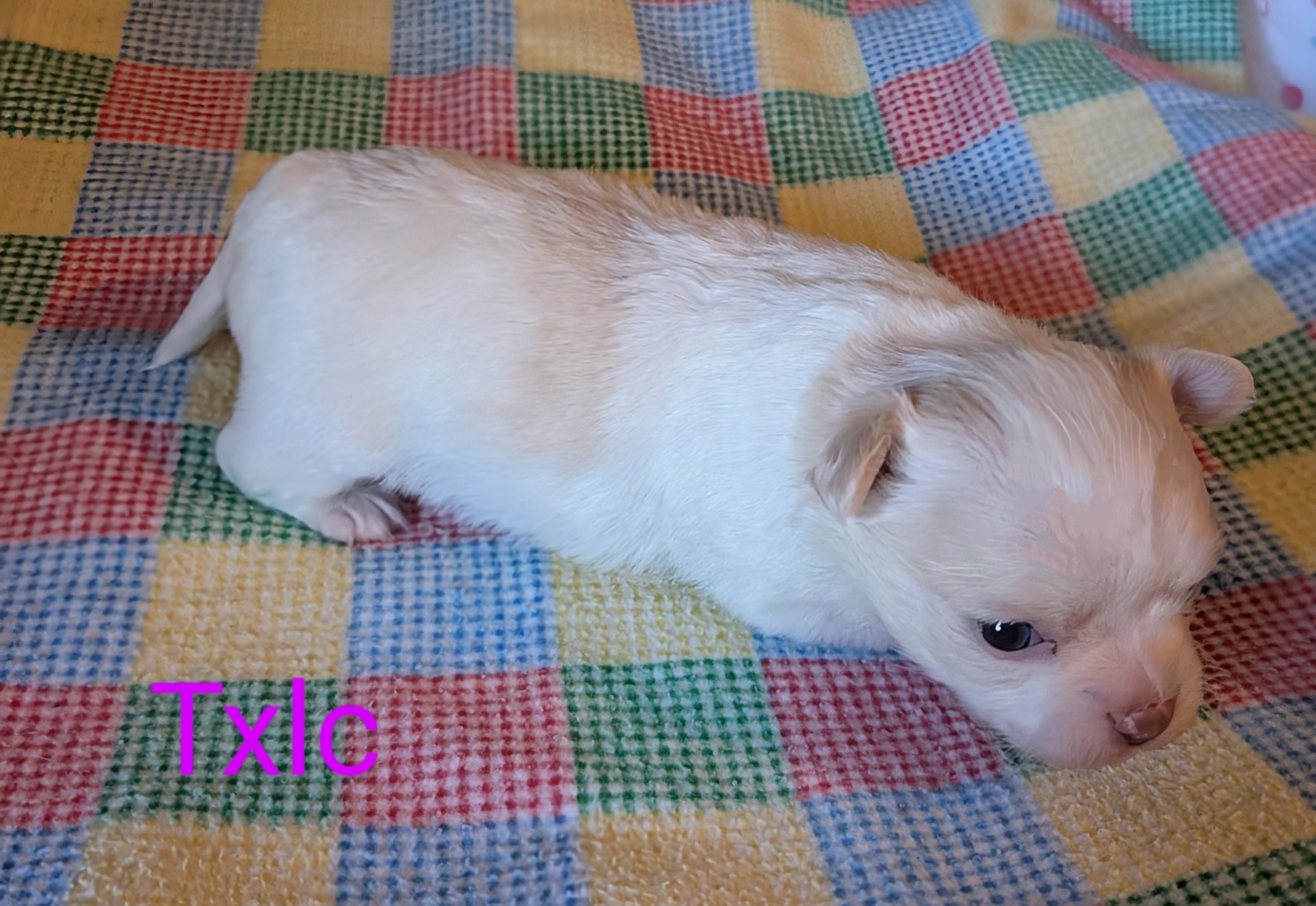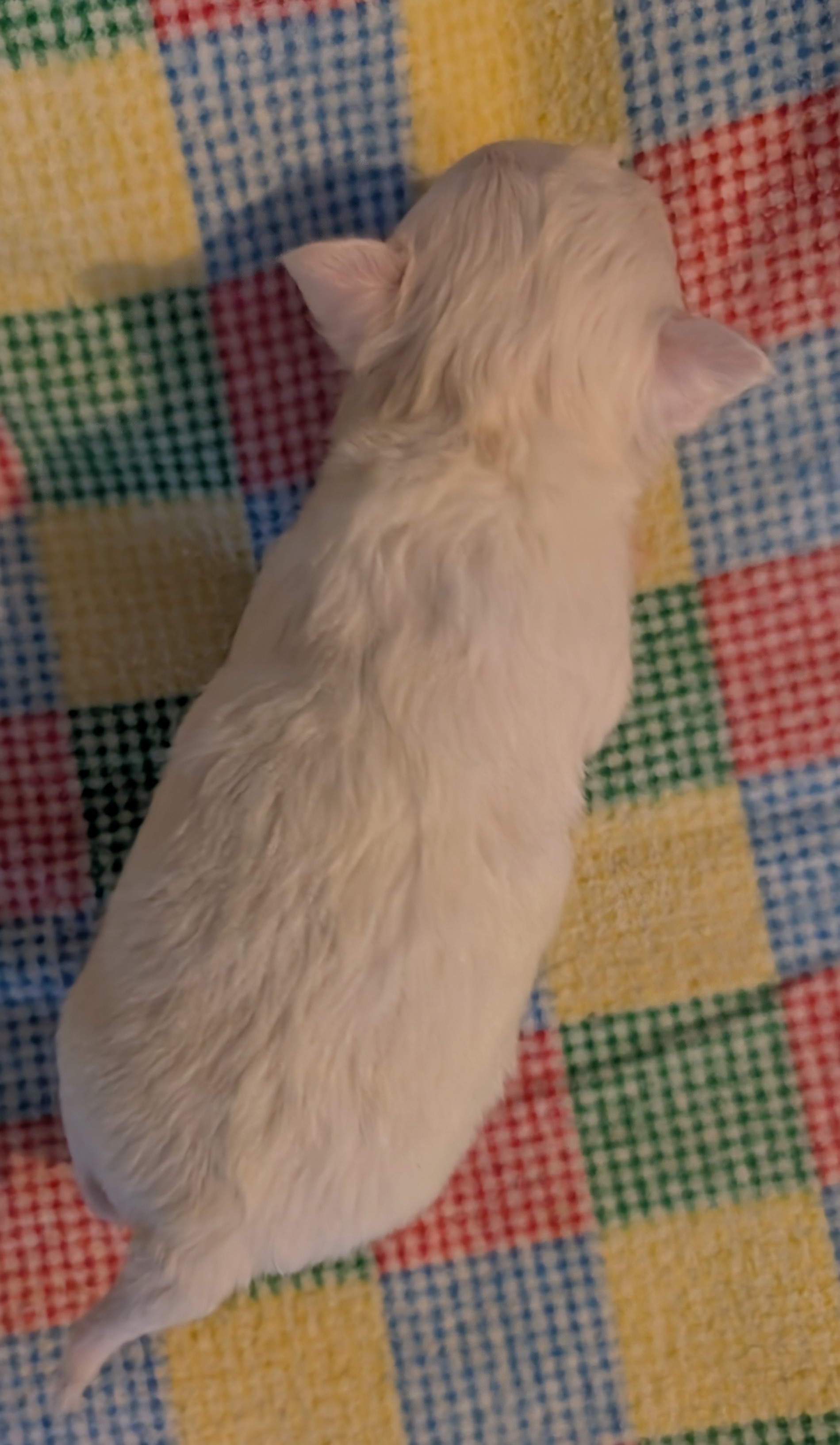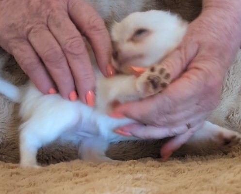 Laura 2/8/25 she is white with gold around head with a large blaze and a spot on back. birth weight