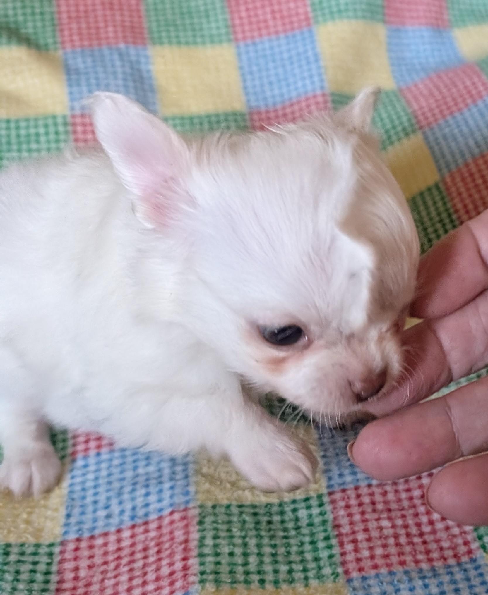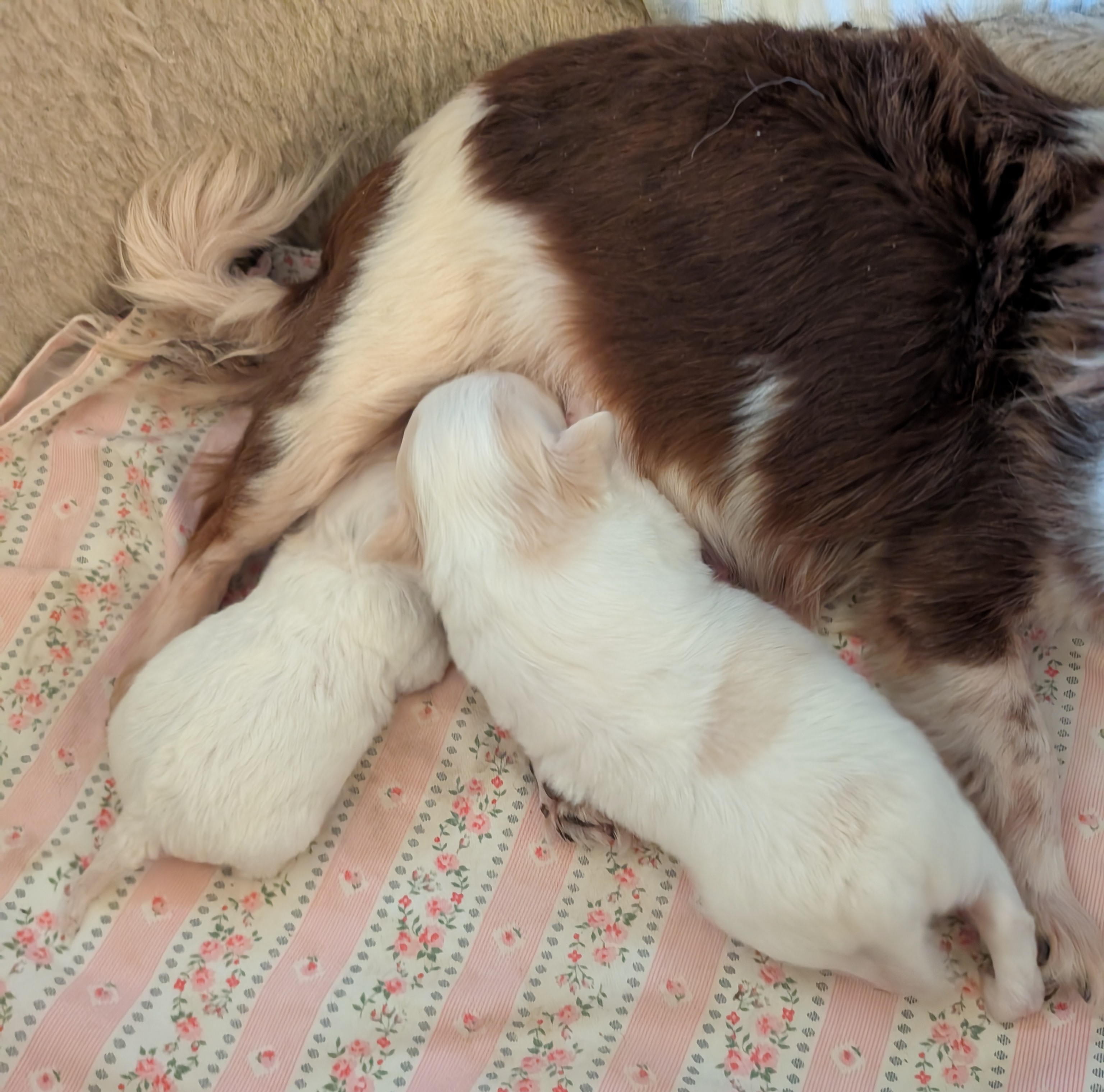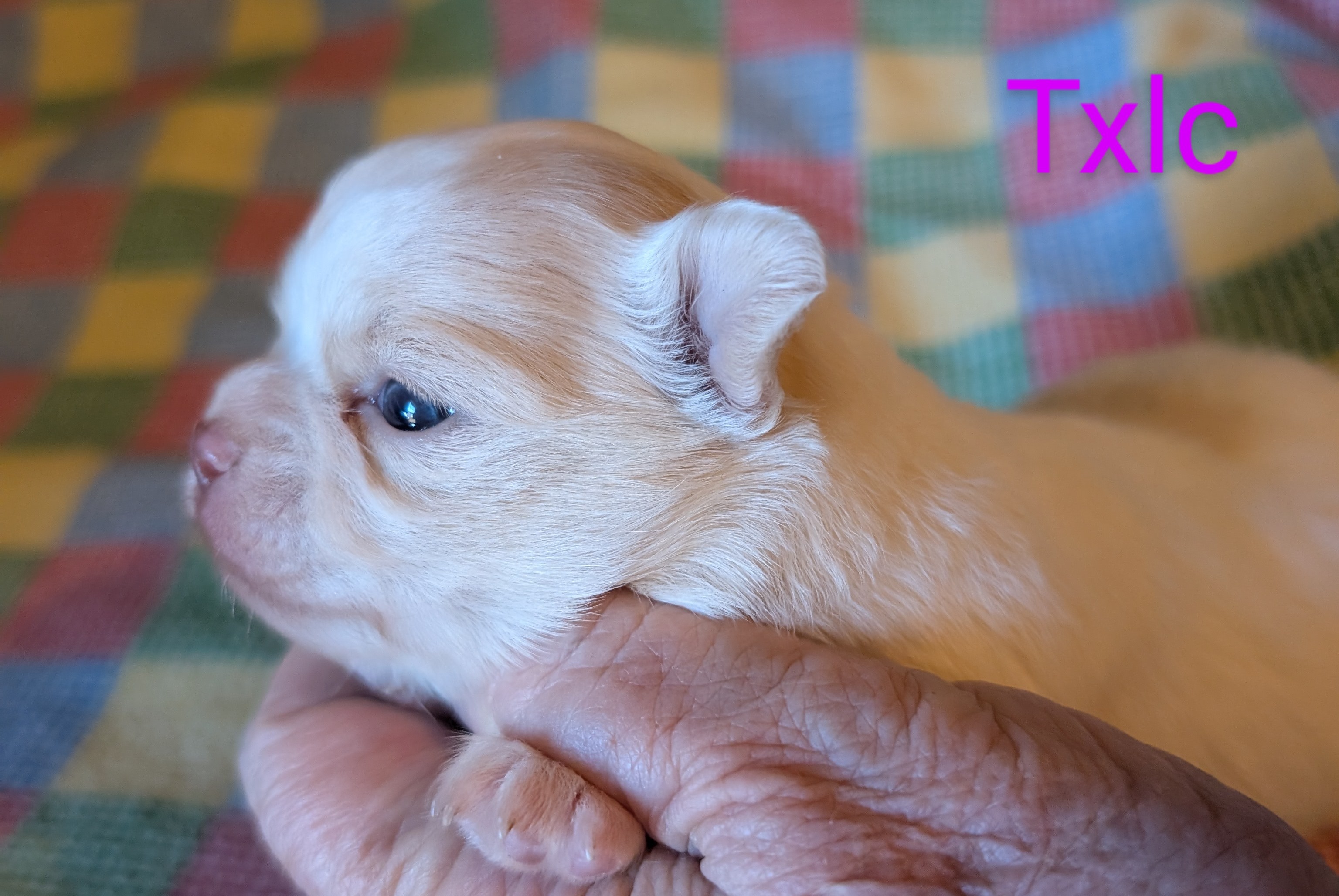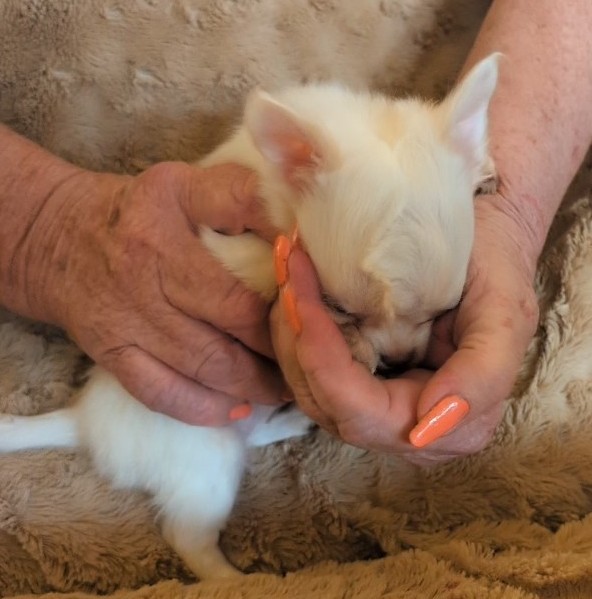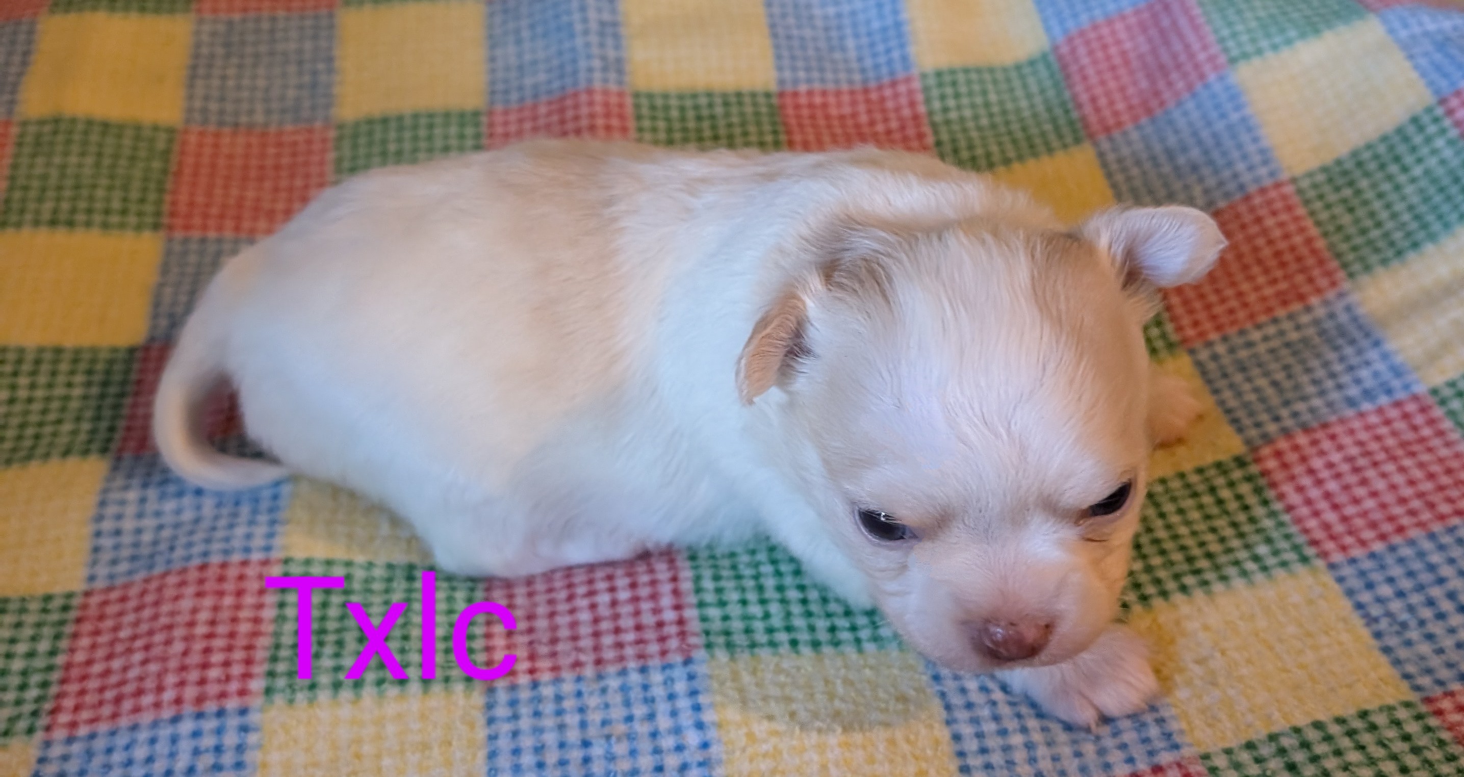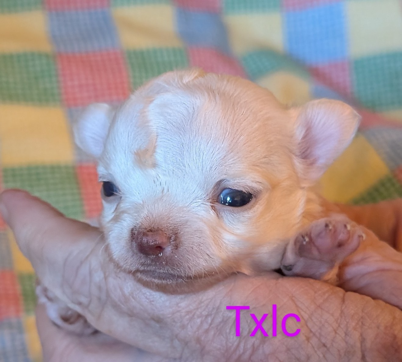 Laura 2/8/25 she is white with gold around head with a large blaze and a spot on back. birth weight