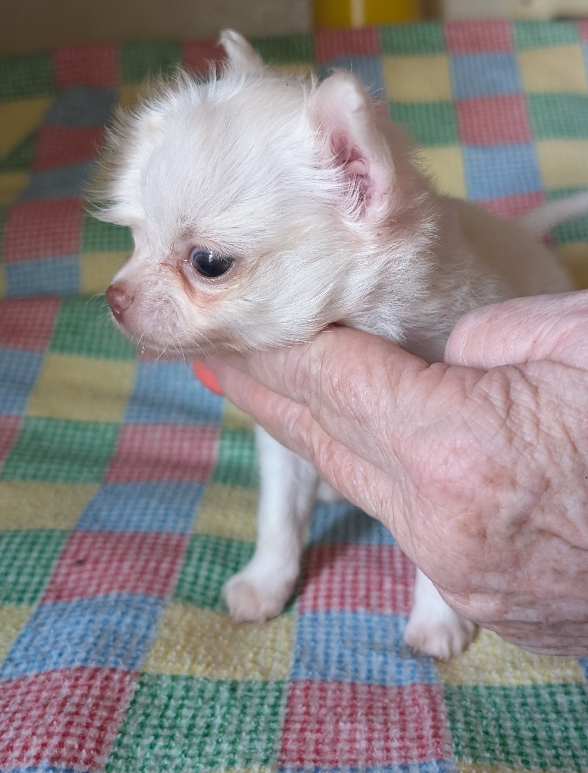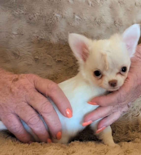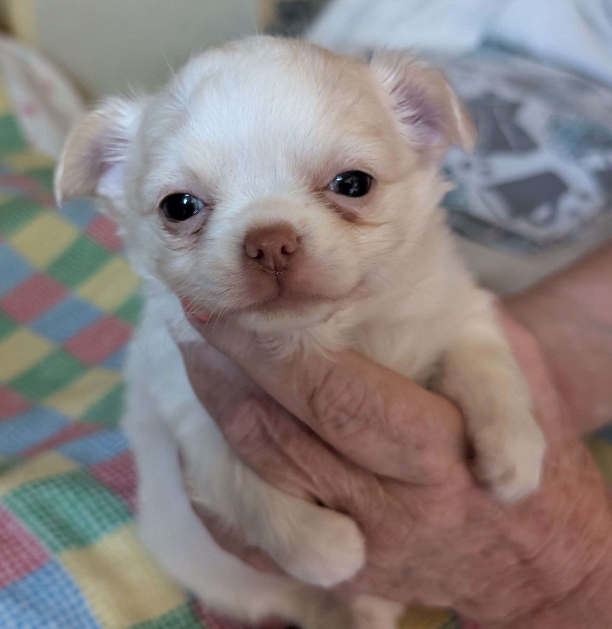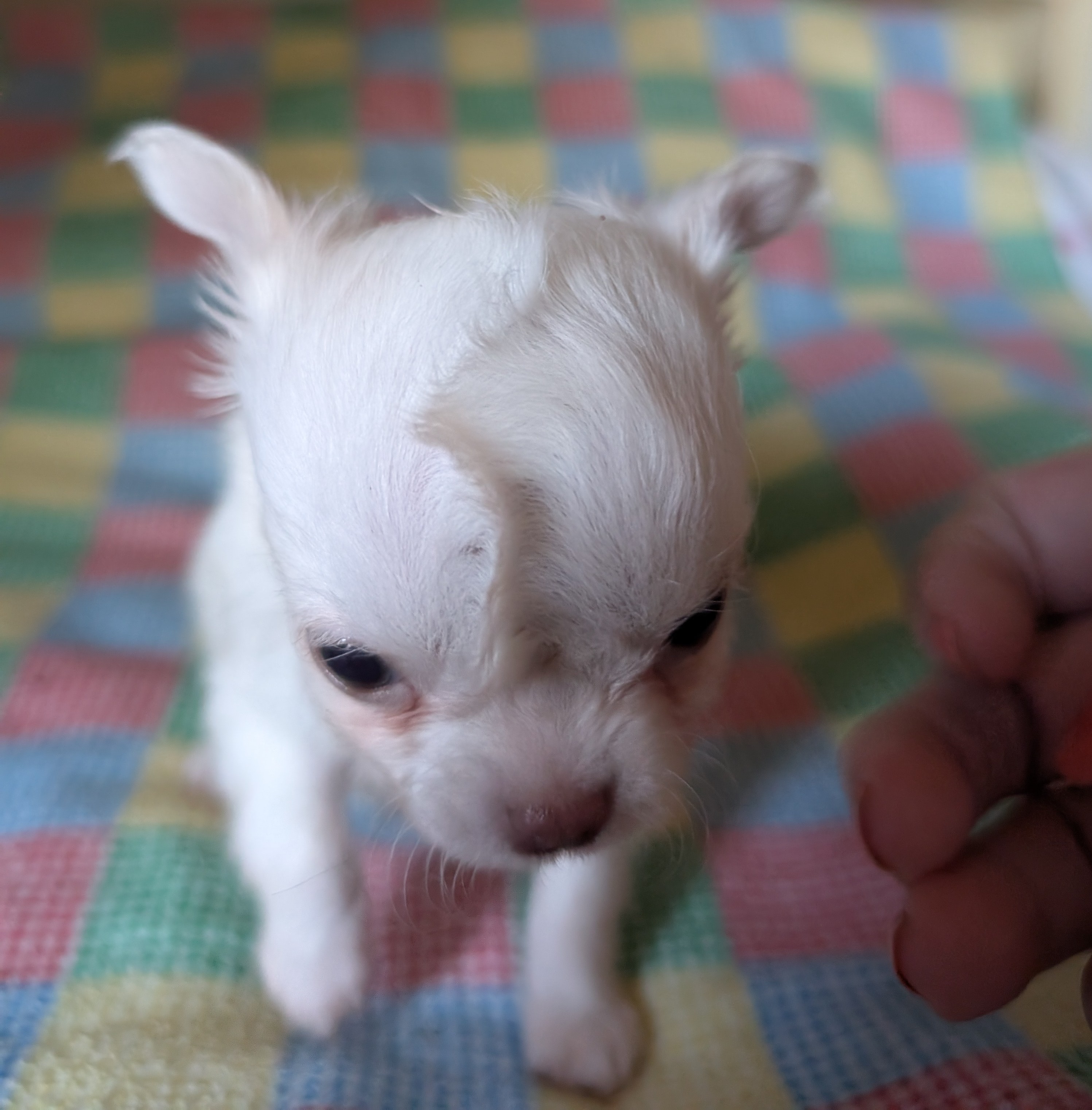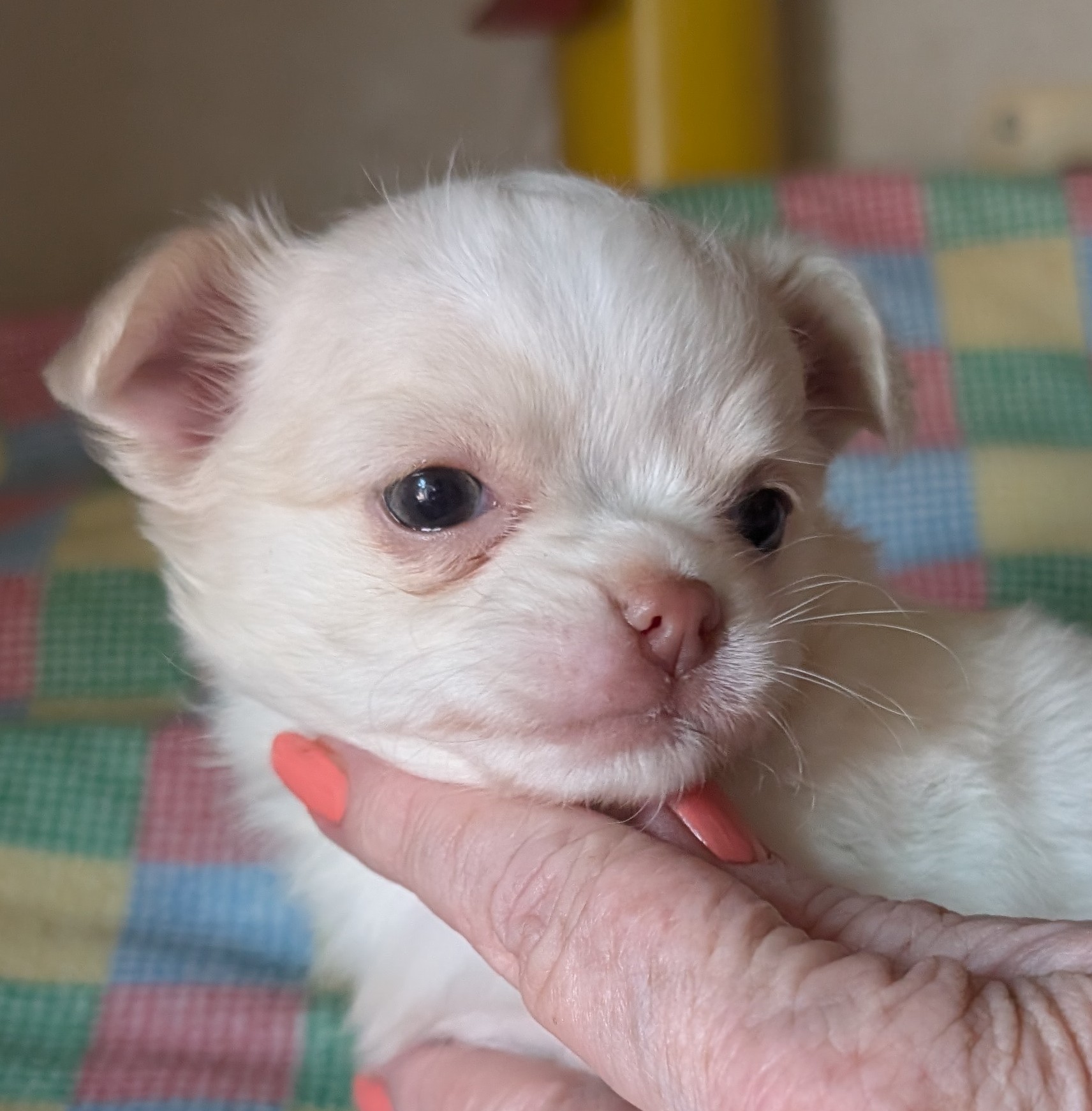 Laura 2/8/25 she is white with gold around head with a large blaze and a spot on back. birth weight